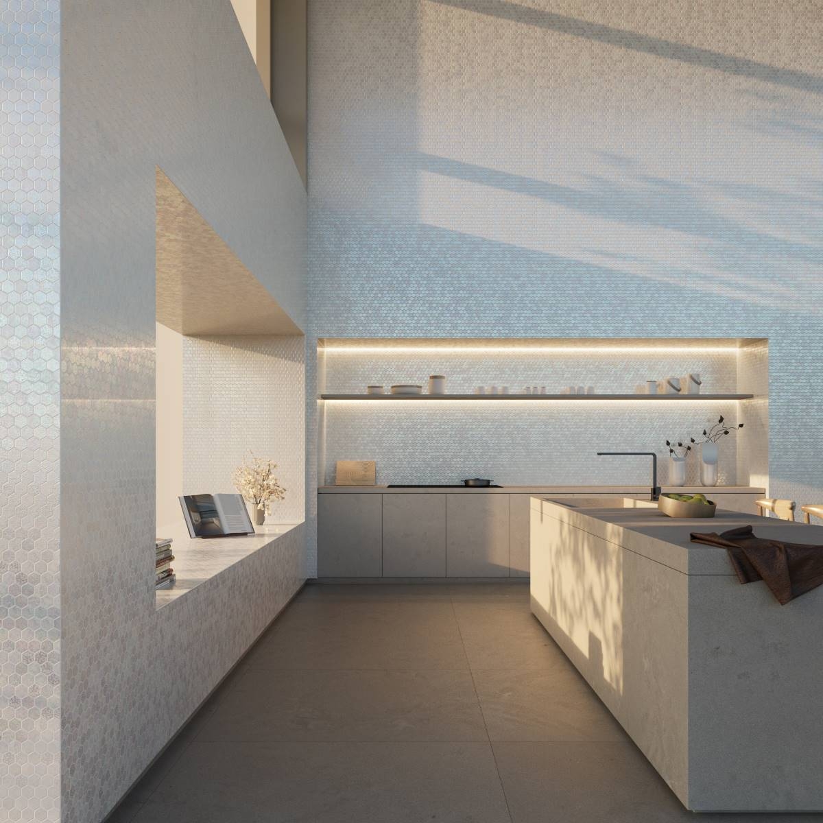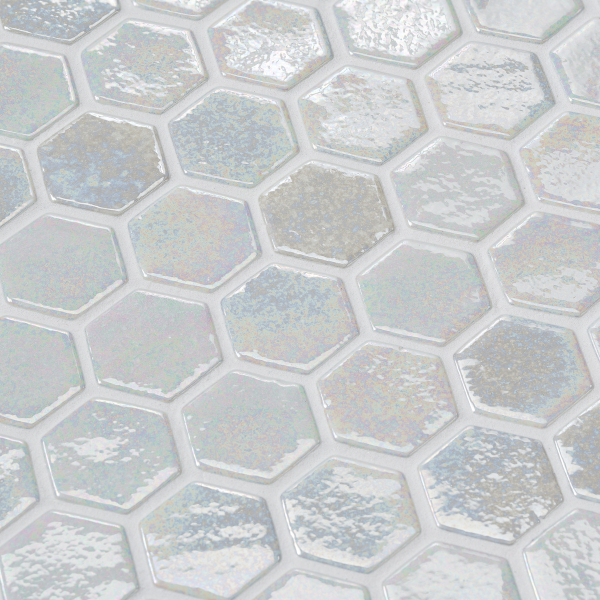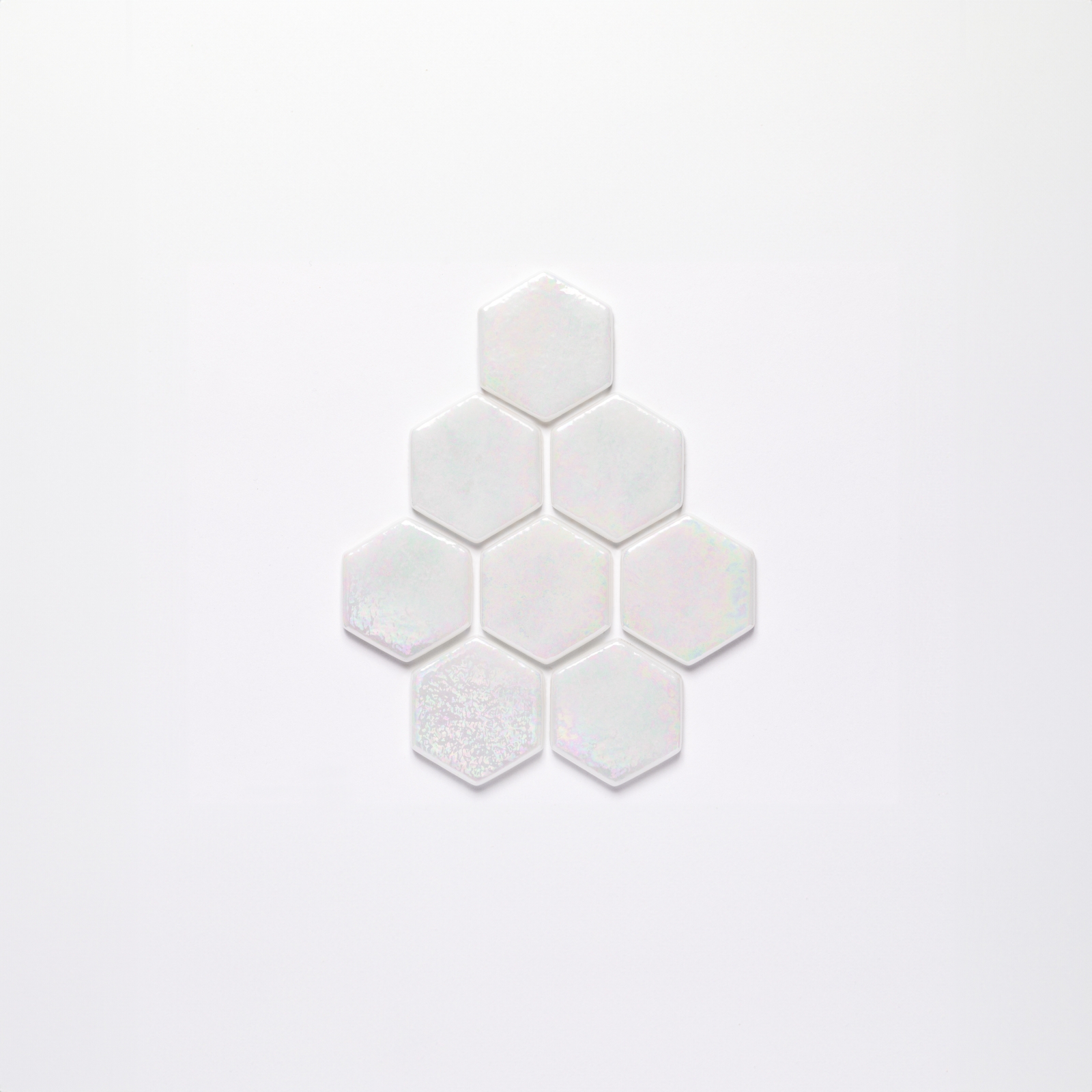 Perla Hexa magia opalizującej, białej, sześciokątnej mozaiki. Ta powłoka z kolekcji Iridescent oferuje subtelny połysk, który przemienia każdą przestrzeń w mozaikowy sen.
